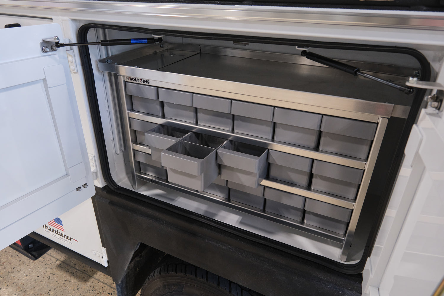 Maintainer Bolt Bins are constructed with heavy-duty 0.090" aluminum sides and impact resistant composite bins rated for 25 lbs each. Each compartment includes three removable aluminum dividers.