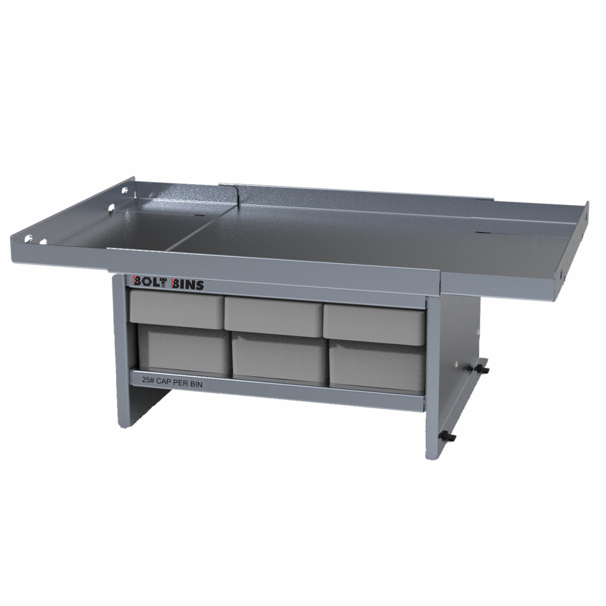 Built with .090" aluminum sides and impact-resistant composite bins rated for 25 lbs each and each compartment includes three removable aluminum dividers for custom organization. The angled shelf design prevents bins from rattling loose during transport. The telescoping top work shelf extends up to 6" on each side for sorting parts or staging hardware.